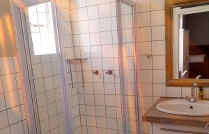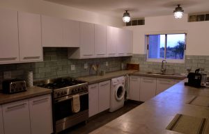 The kitchen features a gas stove, electric oven, a fridge and freezer, microwave, coffee- and tea-making facilities, quality crockery, and cutlery. (See a comprehensive list below) There is a scullery and a separate toilet with a basin. The entertainment area has a fireplace, comfortable sofas and a large dining table. It opens onto a verandah on one side and on the other side the staircase leading to the rooftop deck.