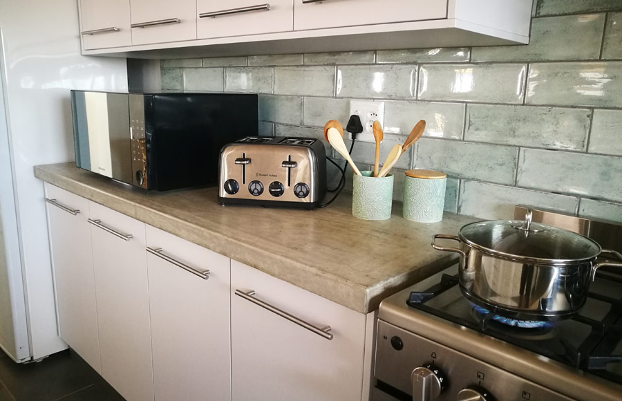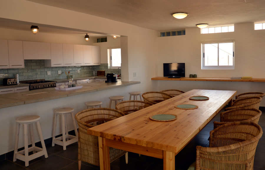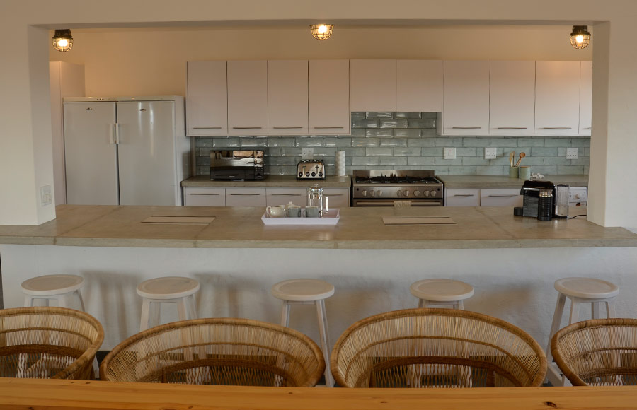 The kitchen features a gas stove, electric oven, a fridge and freezer, microwave, coffee- and tea-making facilities, quality crockery, and cutlery. (See a comprehensive list below) There is a scullery and a separate toilet with a basin. The entertainment area has a fireplace, comfortable sofas and a large dining table. It opens onto a verandah on one side and on the other side the staircase leading to the rooftop deck.