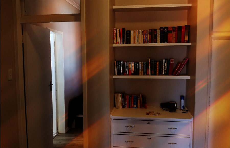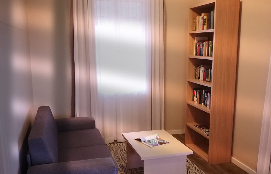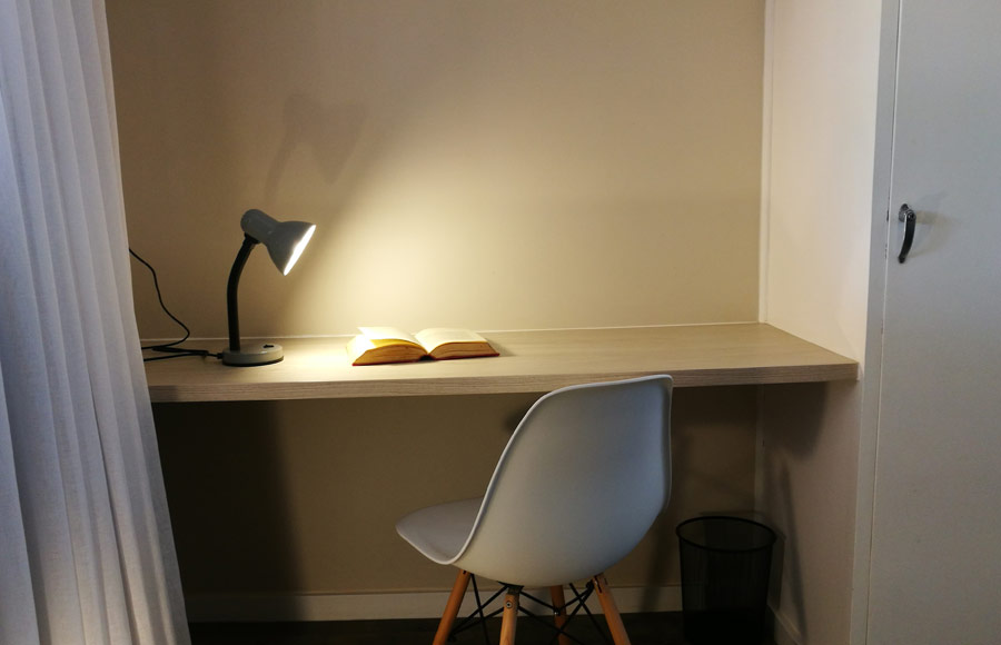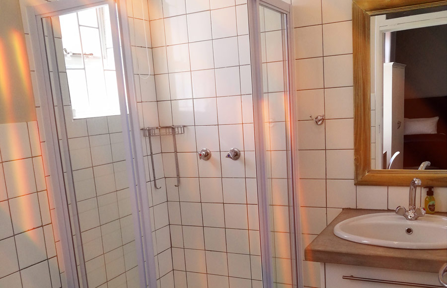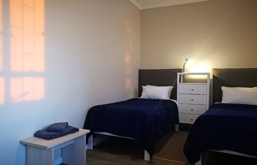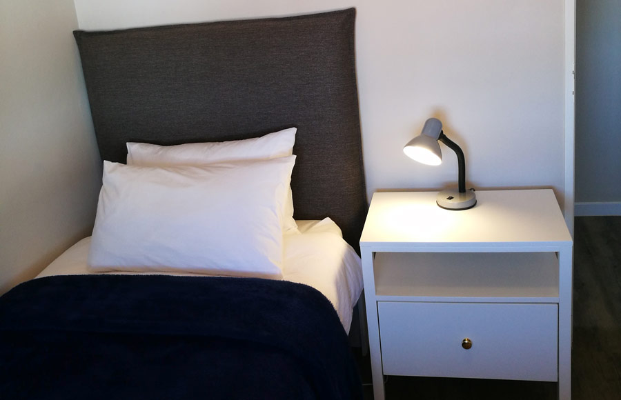 The main bedroom is furnished with a King-size bed with en-suite bathroom (shower, basin and toilet). The 2x two-bed rooms each has en-suite shower and toilet. The 2x single-bed rooms share a bathroom. Each of the four rooms has a small study area, own towels and every bed has an electric blanket to sleep warm. There is a library area and reading corner with sofa.