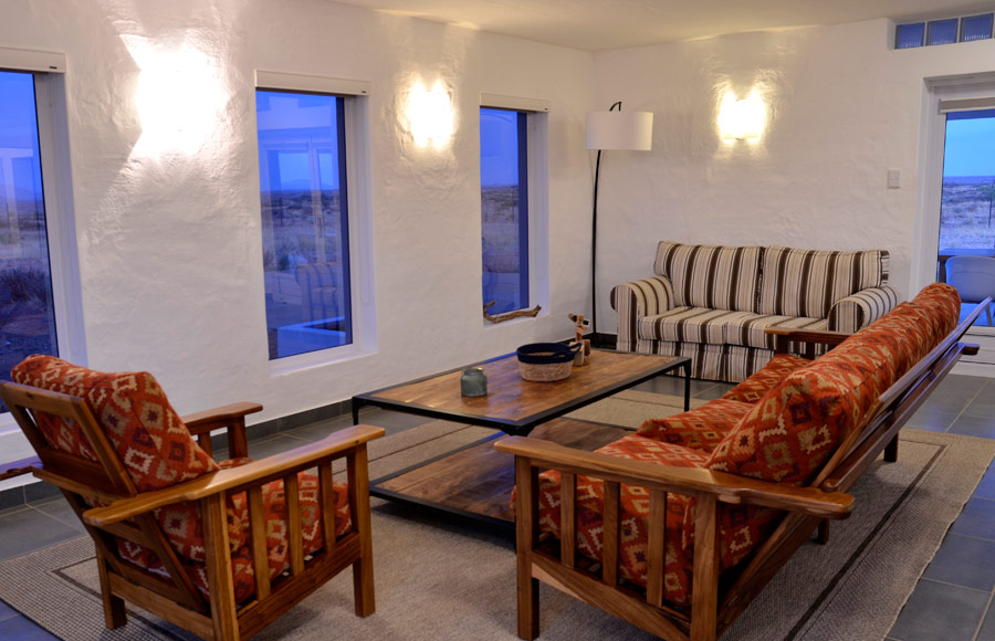 The lodge area comprises two buildings. One building accommodates four comfortable rooms for eight people, while the other building provides spacious living quarters. It has been designed in such a way to take full advantage of the 180 degree views. The secluded location without light pollution ensures a clear, spectacular starry sky.